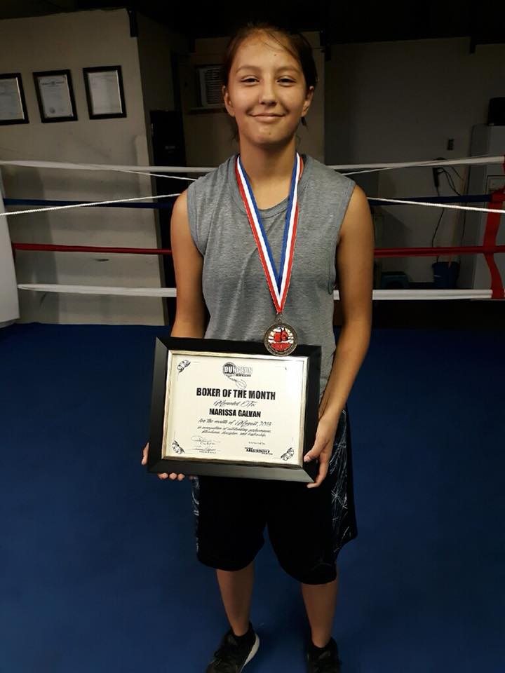 Coach Teresa: “Quiet but oh so Powerful” that is what I see when Marissa walks in for our training sessions. When I first met Marissa I approached her with a hug and quickly found out that she was not the hugging type but I told myself not to give up. I began to notice a certain trait of hers, she was real quiet but observed everything in such a way unlike many. Marissa pours her heart out when it comes to train she always strives to be better than she was the prior day and accomplishes her goals with flying colors. She has become more comfortable with everyone around her, she teams up with others in the club to work on their combinations thus not only helping herself but also helping her team mates. It is an honor and a blessing to have such an amazing young Lady as part of the Dungeon Squad!!